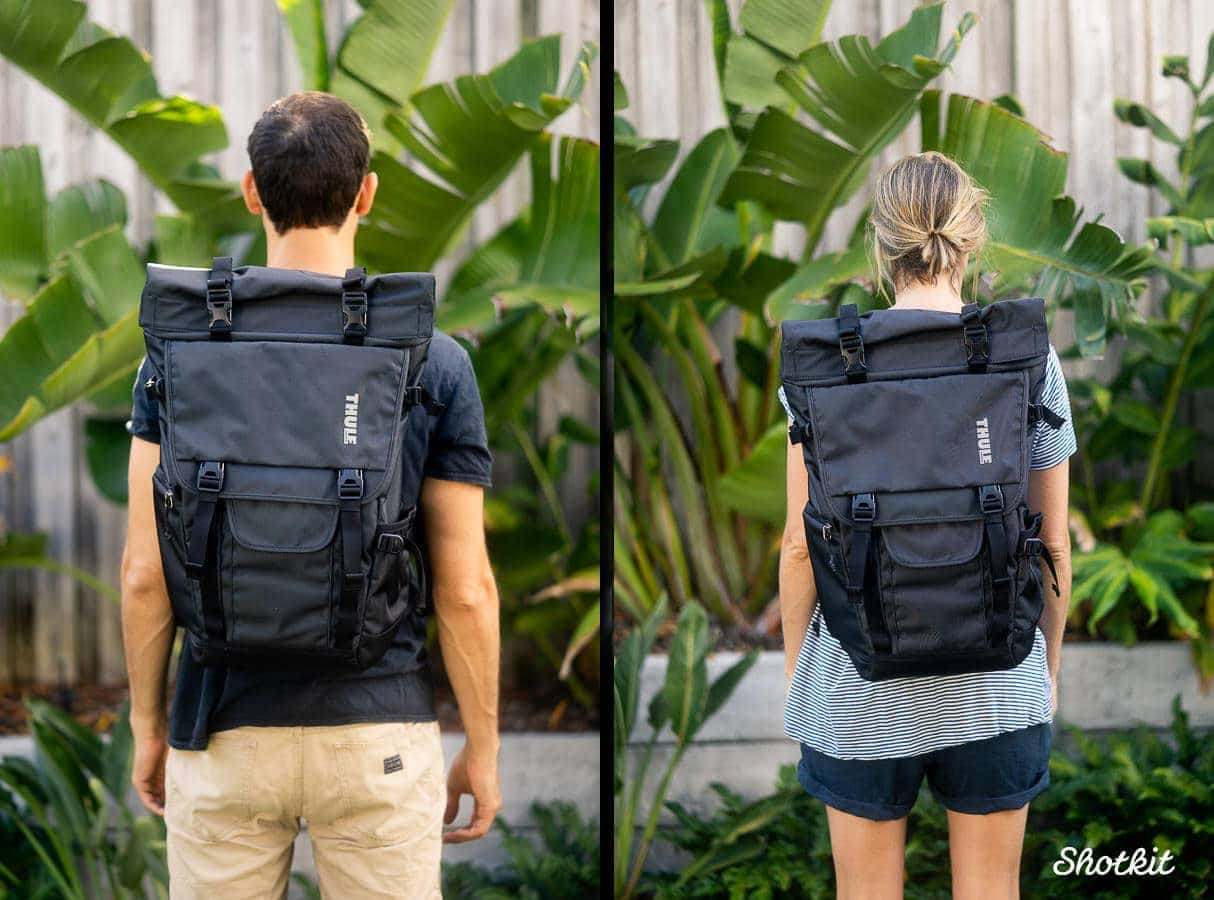 The accent colour adds to an otherwise drab exterior. I’m not a huge fan of the prominent Thule branding, though I know this won’t bother most people. Looks great on my back and on my wife’s.